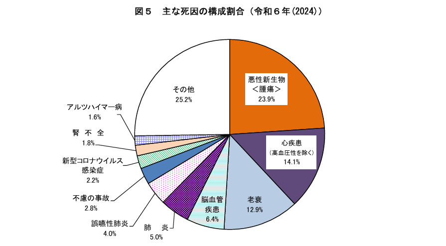 2024年における厚生労働省の統計によると、日本人の死亡原因のうち肺炎は5.0%、誤嚥性肺炎は4.0%を占めています(円グラフ参照)。