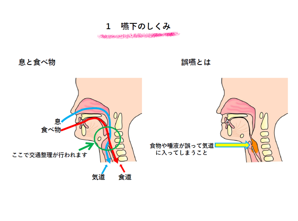 この切り替えがスムーズにいかず、食べ物や唾液が誤って気道に入ってしまうことを「誤嚥(ごえん)」といいます。